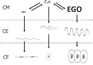 Fig. 2 - Os desequilíbrios fundamentais da mente (CM, campo do ego) determinam as perturbações do campo energético (CE), que terminam, por sua vez, impondo-se ao campo físico (CF), representado pela célula. Esta se perturba, destrói-se ou hipertrofia-se. No centro, vemos em ação a Psora; à esquerda, a Sífilis; e à direita, a Sicose, nos planos mental, dinâmico e físico, de cima para baixo, respectivamente.